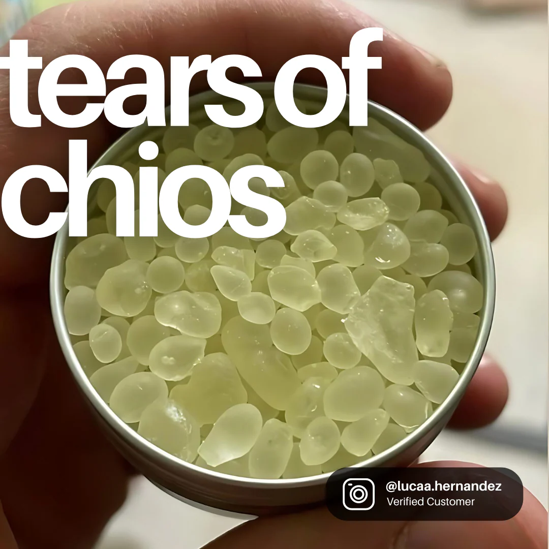 Unlike other brands, we remove tiny crystals with our meticulous filtering process, ensuring the largest mini mastic gum crystals end up in your tin by eliminating all powder and finer mastic pieces.